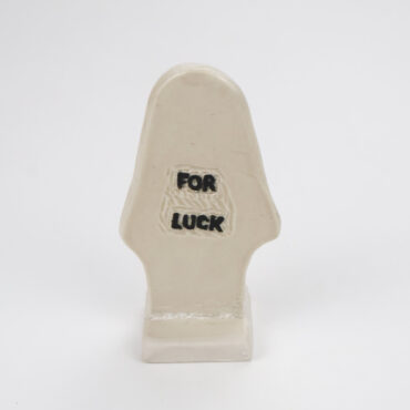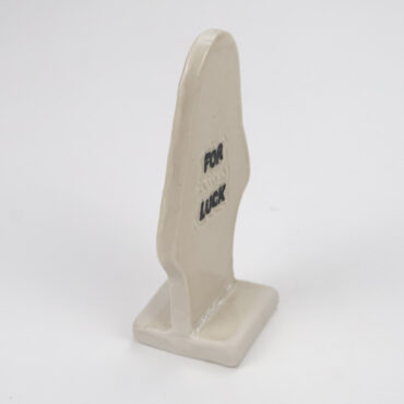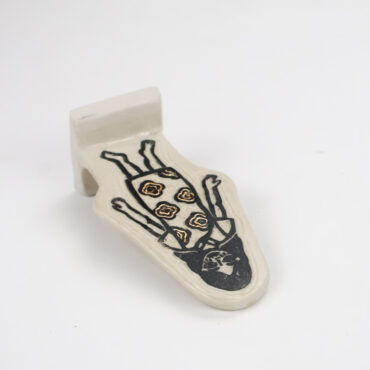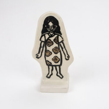 Figurine White,block print underglaze on porcelain, celadon glaze, 1x1x5″